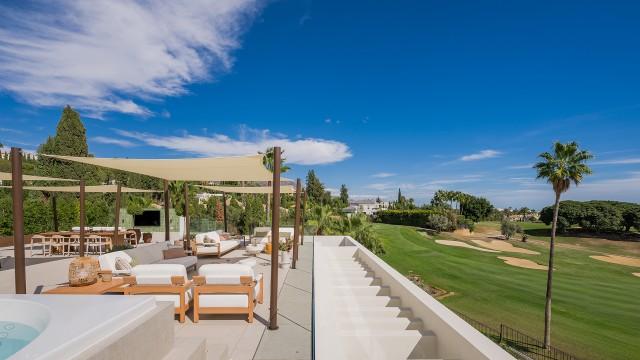 Newly Built Modern Frontline Golf Villa for sale in Nueva Andalucia. This outstanding design villa has an amazing front golf position and it's all about entertainment and views. When you step into this elegant villa, you are welcomed by a modern and sleek living space with a nice design kitchen in an open plan to the dining and living room. Through the large floor to ceiling glass doors, you'll get an amazing view over the golf course of Los Naranjos. Furthermore, on this level there's 4 bedrooms, all en-suite and with its own terrace. The master bedroom with it's almost 40 m2 includes a walk-in closet and designer bathroom in an open plan to create that luxurious suite feeling. The pool area and terrace offer several lounge areas and water features nicely connected with the pool. Here's also a buggy garage with direct access to the golf course. The roof terrace is every entertainers dream. Here's you'll find the outdoor kitchen, seating and dining areas, outdoor cinema and the villas second pool. All offering amazing views over the golf course and valley. In the basement there's a gym dressed in dark wooden walls and ceiling as well as the home office.