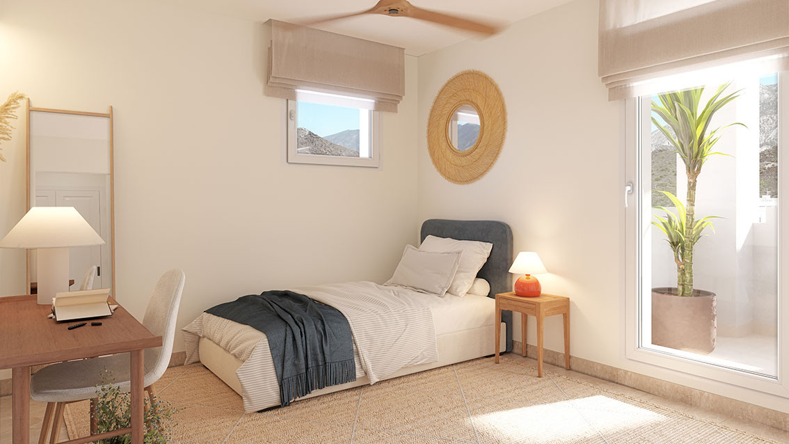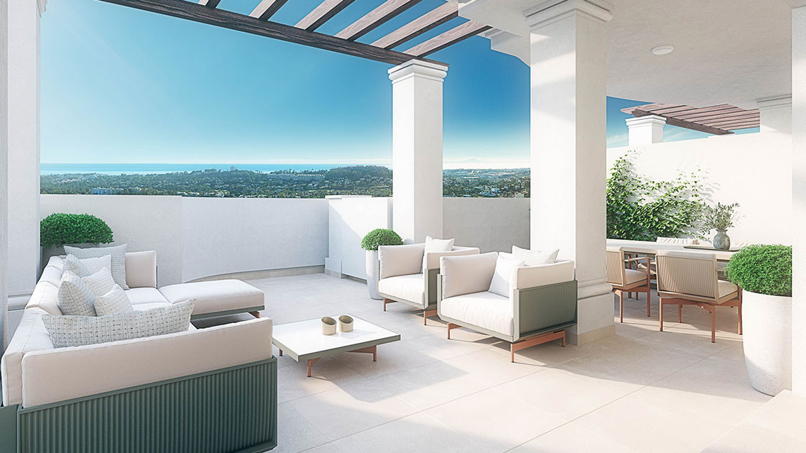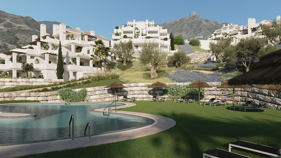 Setting: Close To Golf, Close To Sea, Close To Marina Orientation: South East Condition: New Construction Pool: Communal Climate Control: Hot A/C, Cold A/C Views: Mountain, Panoramic, Garden, Pool, Courtyard Features: Lift, Near Transport, Private Terrace, Solarium, Gym, Storage Room, Ensuite Bathroom Kitchen: Fully Fitted Garden: Communal Security: 24 Hour Security Parking: Underground Category: New Development |