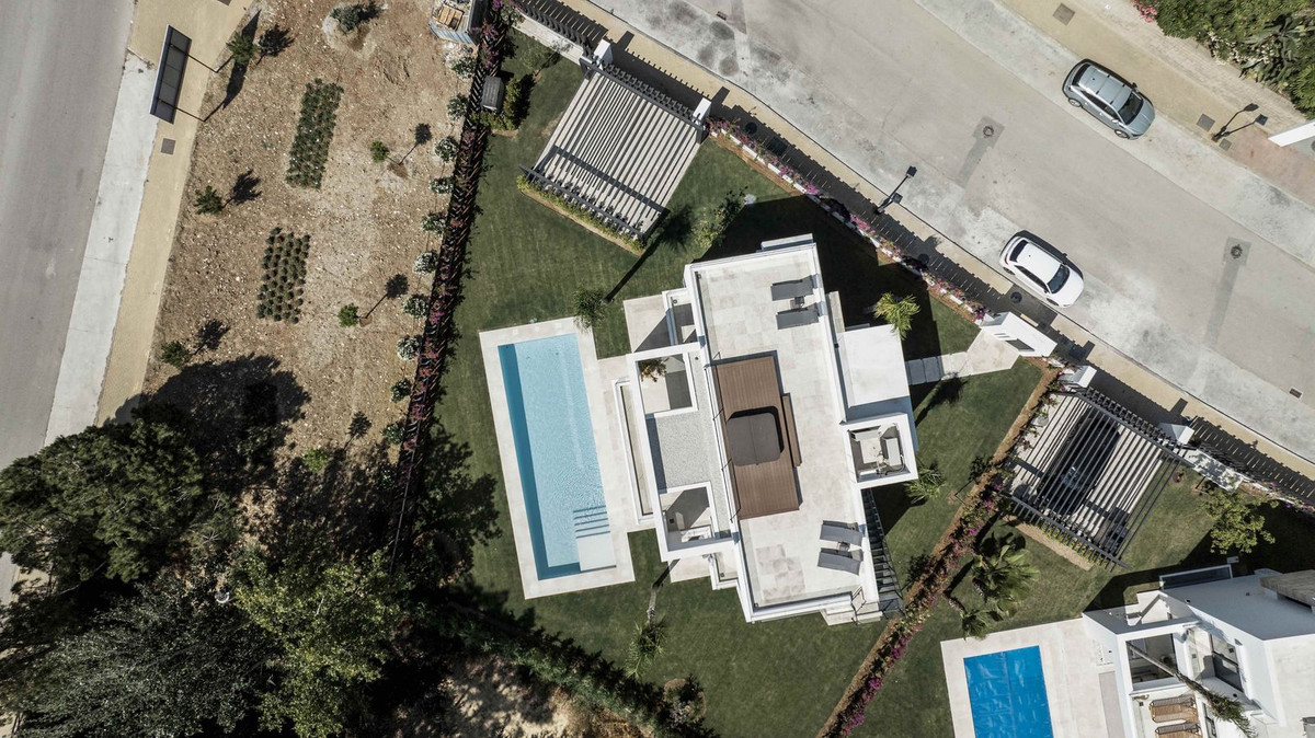 Stunning modern and elegant villa, located in one of the most prestigious areas of the New Golden Mile, between Marbella and Estepona. Just 1 km from the beach and a 10-minute drive from Puerto Banús, this property perfectly combines luxury, comfort, and an unbeatable location. Spread over three levels plus a solarium, the villa offers bright and spacious interiors with high ceilings and panoramic windows. On the main floor, you will find an open-plan living room with a designer kitchen, dining area, fireplace, and guest toilet. The first floor features three en-suite bedrooms with private bathrooms and terraces, including a master suite with a walk-in closet. The lower level includes a cinema room, bar, guest bedroom, laundry room, and gym. The rooftop solarium boasts a jacuzzi and chill-out areas with sea and mountain views. Additional features include underfloor heating, smart home automation, sound system, private swimming pool with garden, and parking for two vehicles. The development offers exclusive amenities: a 9-hole golf course, spa, gym, indoor pool, coworking space, Mediterranean restaurant, as well as tennis and paddle courts. The area also provides prestigious international schools, supermarkets, restaurants, and all necessary services. A unique opportunity to acquire a luxury residence in a natural and exclusive setting, ideal both as a home and as an investment.
