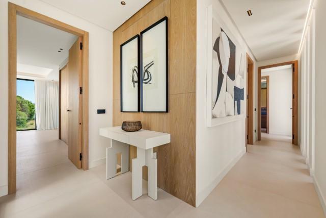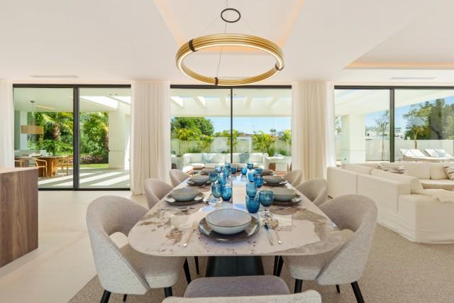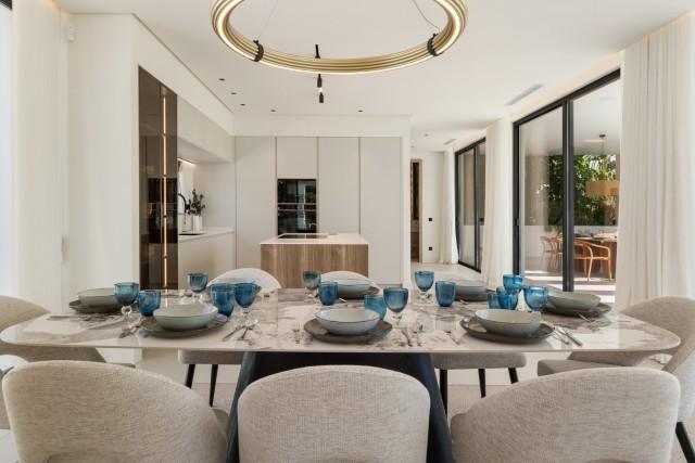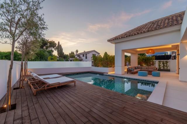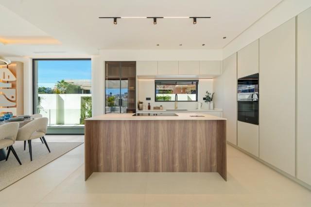 Experience contemporary coastal living at its finest in this exceptional 5-bedroom luxury villa for sale in San Pedro de Alcántara, one of Marbella’s most sought-after beachside neighborhoods. Perfectly blending sleek modern architecture with refined interiors and resort-style amenities, this home delivers sophistication, comfort, and the relaxed elegance of the Mediterranean lifestyle. Set on a 612 m² plot with 446 m² of built space, the villa is surrounded by lush greenery and enclosed by clean white walls for privacy. Its south-facing orientation bathes every corner in natural light, while the design maximizes indoor-outdoor living. Outside, a sparkling private pool with a stylish wooden deck and expansive covered terrace invites effortless entertaining. The rooftop solarium provides an elevated sanctuary for sunbathing, sunset cocktails, or relaxing under the stars. Inside, the atmosphere is bright and airy, with floor-to-ceiling windows, neutral tones, and elegant recessed lighting enhancing the sense of space. The open-plan living and dining area features a custom entertainment wall and flows seamlessly into the state-of-the-art kitchen, complete with a warm wood island, high-end integrated appliances, and sleek cabinetry — the perfect blend of design and functionality. Each of the five bedrooms is a tranquil retreat, featuring large terraces and spa-style en-suite bathrooms with floating vanities, freestanding bathtubs, and marble finishes. The primary suite impresses with its spacious layout and direct access to a private sun terrace, offering serene views and complete privacy. On the lower level, a fully equipped gym, sauna, and steam room create a private wellness retreat, while a secure two-car garage and refined entrance complete the experience. Located just moments from the beach and a short drive to Puerto Banús and Marbella Town, this villa is the epitome of modern Mediterranean luxury — ideal as a family residence, vacation home, or high-end investment on the Costa del Sol.