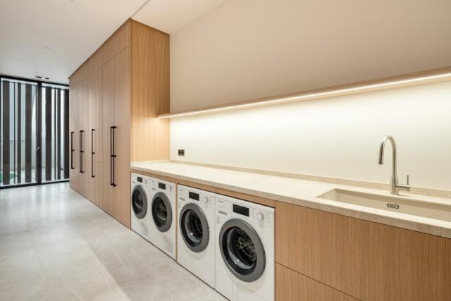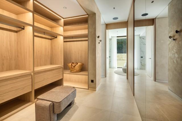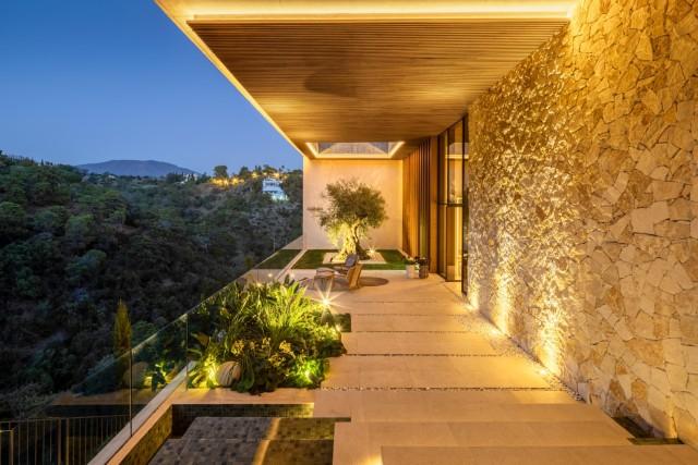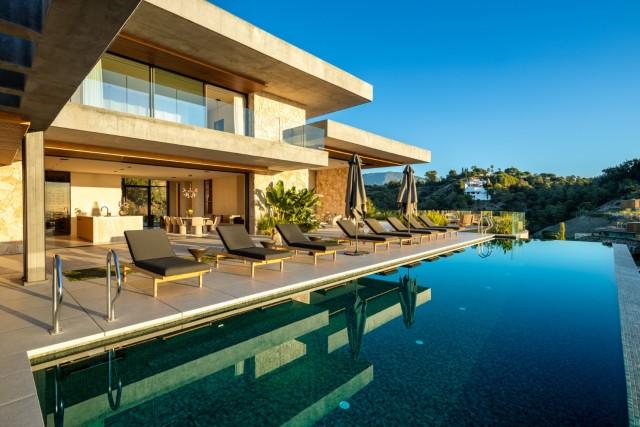 Located within the prestigious gated hillside estate of El Madroñal, in the municipality of Benahavís, this newly built architectural residence represents a rare combination of contemporary design, privacy and elevated panoramic views across the Mediterranean coastline and surrounding mountains. Scheduled for completion in 2025, this exceptional south-facing villa occupies a commanding position above the coast, offering uninterrupted sea and mountain views from almost every level. Designed by a highly regarded architect, the property has been conceived to deliver a refined lifestyle where architecture, technology and natural surroundings are seamlessly integrated. Set on a generous 4,149 m² plot, the villa offers approximately 1,028 m² of built area distributed across three levels, complemented by 492 m² of expansive terraces. A long private driveway leads to a striking main entrance, where a mature olive tree framed behind glass immediately establishes the tone of understated luxury and architectural presence. The main living level unfolds into an elegant open-plan lounge and dining area, centred around a contemporary fireplace and framed by full-height sliding glass doors. These open directly onto wide terraces, creating a fluid indoor-outdoor living experience ideal for both everyday enjoyment and large-scale entertaining. The state-of-the-art kitchen is equipped with premium Gaggenau appliances and is complemented by a discreet secondary chef’s kitchen, allowing seamless hosting while maintaining a refined main living environment. The villa features six spacious bedroom suites, each with its own private bathroom. The entire upper level is dedicated to an impressive master retreat, offering a private sea-view terrace, dual walk-in wardrobes and a luxurious en-suite bathroom. Every room has been carefully proportioned to provide privacy, comfort and abundant natural light. Throughout the home, craftsmanship and material quality are evident in every detail. Herringbone wooden flooring, custom leather-wrapped door handles, bespoke lighting controls inspired by automotive design, and electronically operated floor-to-ceiling windows and doors enhance both the aesthetic and functional performance of the home. Technical areas have been thoughtfully positioned outside the main structure, simplifying maintenance while preserving interior serenity. The lower level has been designed as a private wellness and entertainment environment, offering a fully equipped gym with both indoor and outdoor training areas, a private cinema room, games lounge, hammam, plunge pool and relaxation spaces. A two-bedroom guest apartment with independent access provides excellent accommodation for visitors or staff. Further features include a climate-controlled wine cellar, a private lift connecting all floors and a Zennio smart home system, ensuring complete control over lighting, climate and security. Outside, beautifully landscaped gardens surround a salt-water swimming pool, multiple sun terraces and an outdoor kitchen with dedicated dining and lounge areas. An automated irrigation system supports year-round landscaping, while parking is currently provided for four vehicles with the option to create a fully enclosed garage if required. The estate enjoys controlled access and 24-hour security, offering residents a discreet and highly secure environment. Positioned approximately 400 metres above sea level, the surrounding natural setting is defined by pine forests, cork oak and olive trees, with open views towards the Serranía de Ronda mountains and the Mediterranean Sea. Despite its tranquil setting, the property is located only minutes from daily amenities and within short driving distance of the beaches, Puerto Banús and Marbella. Golf enthusiasts benefit from proximity to leading courses such as La Quinta Golf & Country Club and Los Arqueros Golf & Country Club, while families have access to respected international schools including Aloha College and The British International School of Marbella. This is a rare opportunity to acquire a newly built contemporary villa in one of the most exclusive residential enclaves on the Costa del Sol, offering architectural distinction, absolute privacy and an elevated lifestyle in a prime hillside setting.