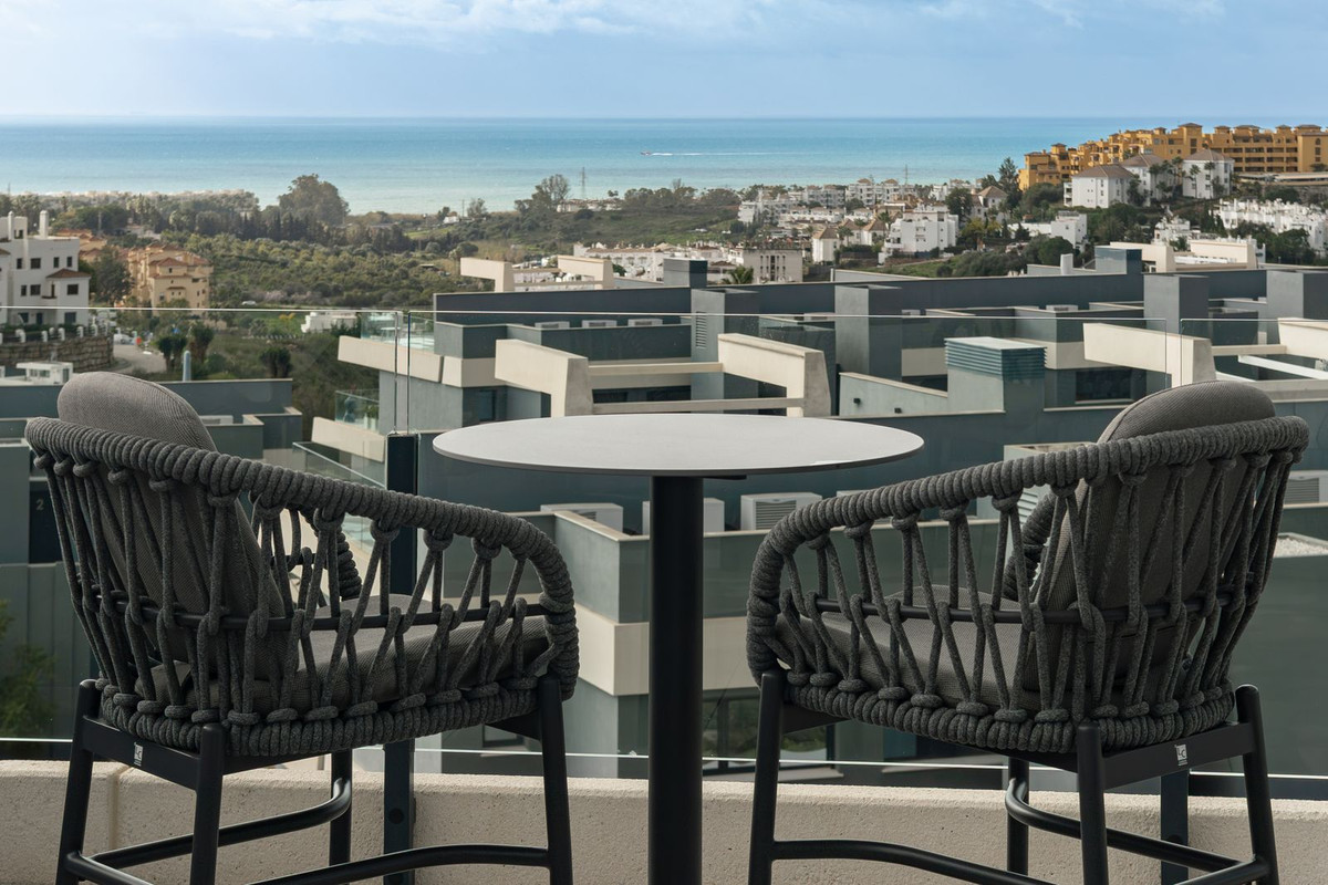This luxurious fully furnished 2-bedroom penthouse is located in the modern and highly sought-after Oasis 325 development, in one of the fastest-growing areas between Marbella and Estepona. The property combines contemporary architecture, excellent natural light, and a seamless indoor-outdoor layout, making it ideal both as a lifestyle home and as a secure investment. One of the true highlights is the spacious private rooftop solarium featuring a jacuzzi and breathtaking 360-degree panoramic views of the open sea and surrounding mountains — the perfect setting to enjoy the Mediterranean climate all year round. The elegant living area flows naturally onto a second generous terrace, creating a beautiful sense of openness and comfort. The fully equipped modern kitchen offers clean lines and high-quality finishes. The apartment includes two comfortable bedrooms, two bathrooms, a utility room, and is sold completely furnished, allowing for immediate use or rental without any additional investment. From the apartment, you have direct elevator access to your private storage room and underground parking space. This newly developed resort-style community offers premium amenities such as concierge service, landscaped outdoor swimming pool, heated indoor pool, spa area, gym, and coworking space, features that significantly enhance both lifestyle quality and rental appeal. Location highlights: • Beach approximately 5 minutes by car • Unicornio Beach Club around 5 minutes • Mercadona 3–4 minutes • Atlas American School of Málaga approximately 10 minutes • International Hospital approximately 5 minutes • Quick access to the A7 connecting directly to Marbella and Puerto Banús The property is currently rented with a 1-year contract, rent paid in advance, and the tenant protected by rental default insurance, providing immediate and secure income for the new owner. A unique opportunity for investors seeking a modern sea-view penthouse with strong rental demand and guaranteed return — or, in the future, a private haven on the Costa del Sol. Viewings available by prior appointment.