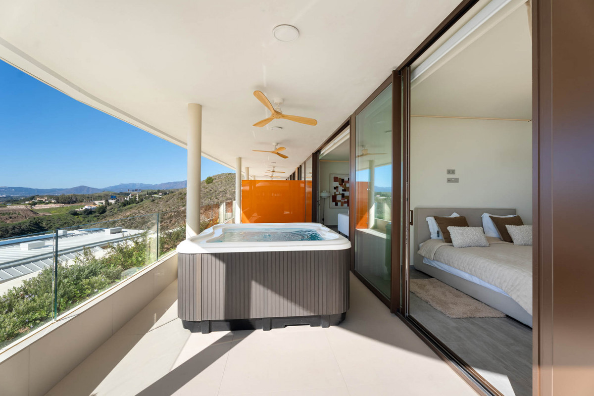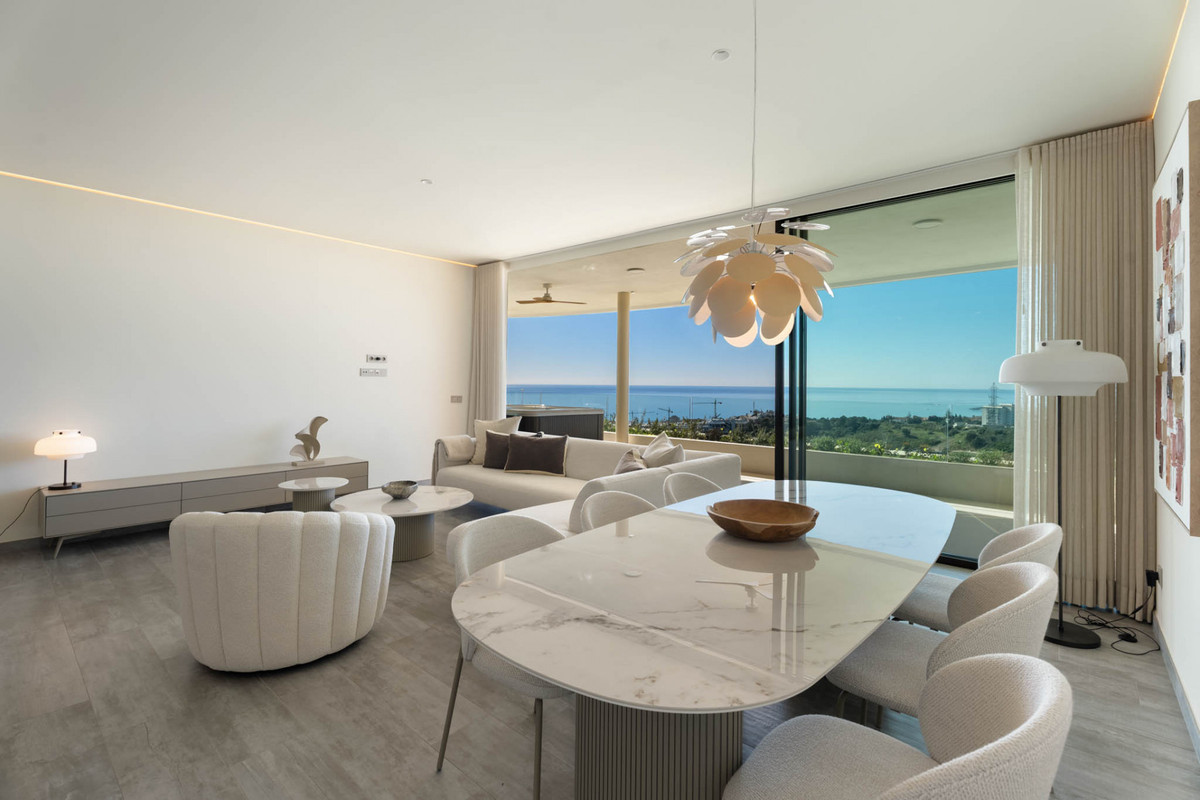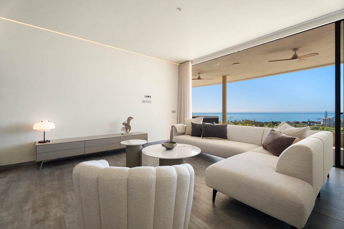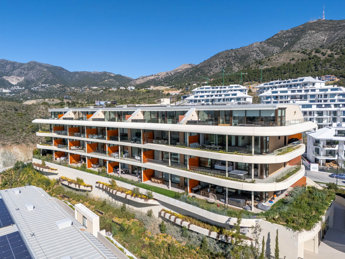 Situaded within a secure residential enclave in El Higuerón, this brand-new three-bedroom corner apartment offers refined contemporary living with open sea and valley views. Located in the most elevated and private phase of the development, the property benefits from protected outlooks due to the agricultural land set in front, preserving long-term views and privacy. With a total built interior of 117,11 m² and a spacious corner terrace, the residence is designed to create a seamless connection between indoor and outdoor living. The southwest orientation ensures natural light throughout the day and evening sunsets over the Mediterranean. The interior layout is carefully arranged. The living and dining area extends across 36.56 m², directly connected to the terrace, creating an ideal setting for entertaining or quiet retreat. The Italian Zampieri kitchen is fitted with AEG appliances and finished with clean architectural lines and functional storage. Saloni ceramic flooring runs throughout the home, reinforcing a cohesive aesthetic. The primary suite measures 17.48 m² and includes fitted Santalucia Mobili wardrobes and an en-suite bathroom with underfloor heating. Two additional bedrooms (12.13 m² and 12.88 m²) share a second bathroom, also with underfloor heating. A separate laundry room adds practicality to the layout. Built in 2025 to European CTE building standards, the apartment incorporates aerothermal climate control for efficient heating and cooling, technical exterior carpentry for enhanced thermal and acoustic insulation, and an upgraded domotics system. Blinds, lighting, and climate settings are managed via wall panels or mobile application. Integrated smart features include flood detection with automatic water shut-off, smoke detection, and power-cut alerts. The property is sold fully furnished by BoConcept and includes two underground parking spaces and a storage room. Residents enjoy landscaped gardens, an infinity pool with sun loungers, and 24-hour gated security. The apartment is within walking distance of Higuerón Resort, spa, and sports facilities, five minutes from the beach, 15 minutes from Málaga Airport, and 20 minutes from Málaga city. Property Highlights - 3 bedrooms | 2 bathrooms | 1 en-suite - 117,11 m² built interior - 81,57m² southwest-facing terrace - Sea and green valley views - Italian Zampieri kitchen with AEG appliances - Underfloor heating in bathrooms - Aerothermal climate control system - Advanced home automation system - Fully furnished by BoConcept - 2 underground parking spaces - Private storage room - 24-hour gated community with infinity pool