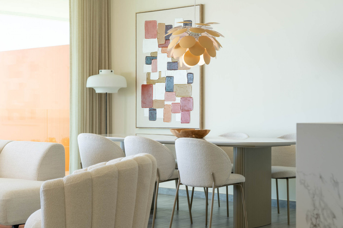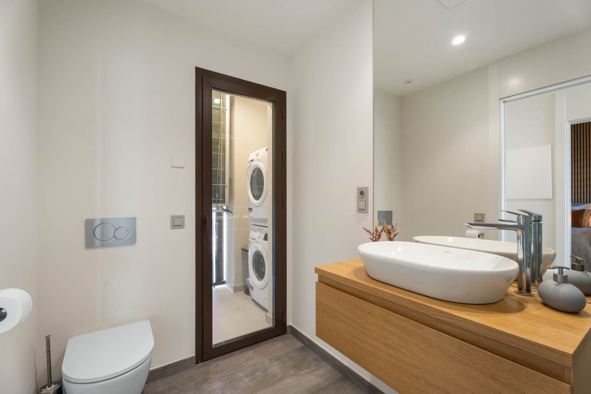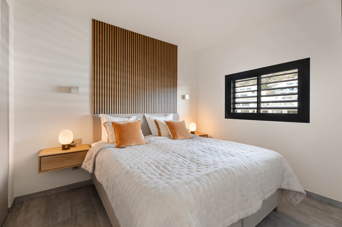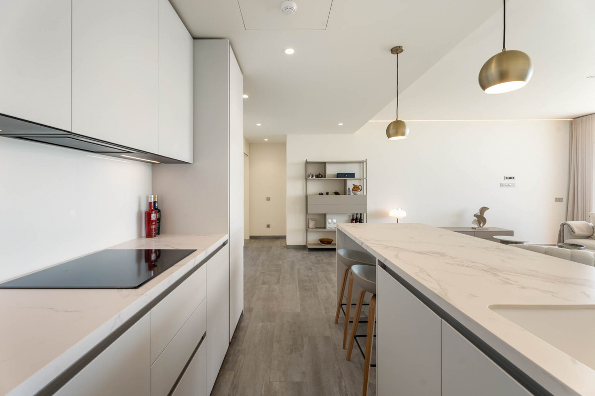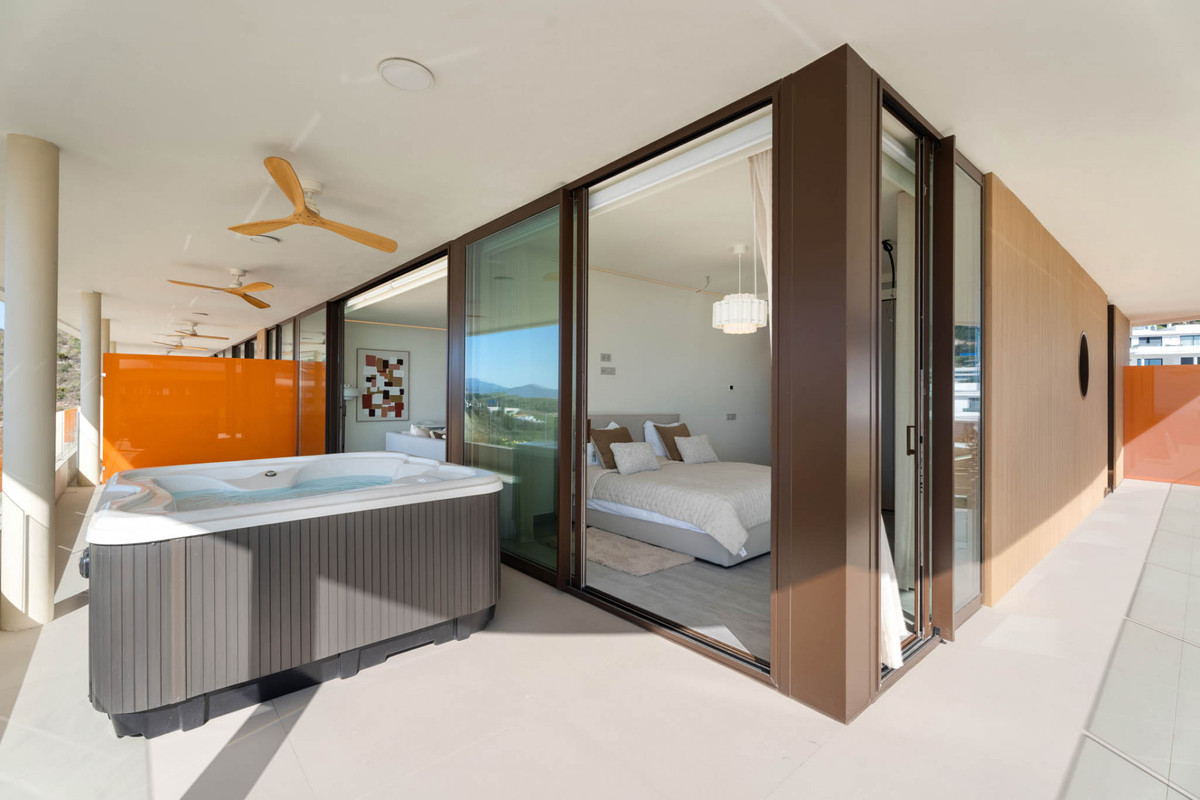 Situaded within a secure residential enclave in El Higuerón, this brand-new three-bedroom corner apartment offers refined contemporary living with open sea and valley views. Located in the most elevated and private phase of the development, the property benefits from protected outlooks due to the agricultural land set in front, preserving long-term views and privacy. With a total built interior of 117,11 m² and a spacious corner terrace, the residence is designed to create a seamless connection between indoor and outdoor living. The southwest orientation ensures natural light throughout the day and evening sunsets over the Mediterranean. The interior layout is carefully arranged. The living and dining area extends across 36.56 m², directly connected to the terrace, creating an ideal setting for entertaining or quiet retreat. The Italian Zampieri kitchen is fitted with AEG appliances and finished with clean architectural lines and functional storage. Saloni ceramic flooring runs throughout the home, reinforcing a cohesive aesthetic. The primary suite measures 17.48 m² and includes fitted Santalucia Mobili wardrobes and an en-suite bathroom with underfloor heating. Two additional bedrooms (12.13 m² and 12.88 m²) share a second bathroom, also with underfloor heating. A separate laundry room adds practicality to the layout. Built in 2025 to European CTE building standards, the apartment incorporates aerothermal climate control for efficient heating and cooling, technical exterior carpentry for enhanced thermal and acoustic insulation, and an upgraded domotics system. Blinds, lighting, and climate settings are managed via wall panels or mobile application. Integrated smart features include flood detection with automatic water shut-off, smoke detection, and power-cut alerts. The property is sold fully furnished by BoConcept and includes two underground parking spaces and a storage room. Residents enjoy landscaped gardens, an infinity pool with sun loungers, and 24-hour gated security. The apartment is within walking distance of Higuerón Resort, spa, and sports facilities, five minutes from the beach, 15 minutes from Málaga Airport, and 20 minutes from Málaga city. Property Highlights - 3 bedrooms | 2 bathrooms | 1 en-suite - 117,11 m² built interior - 81,57m² southwest-facing terrace - Sea and green valley views - Italian Zampieri kitchen with AEG appliances - Underfloor heating in bathrooms - Aerothermal climate control system - Advanced home automation system - Fully furnished by BoConcept - 2 underground parking spaces - Private storage room - 24-hour gated community with infinity pool