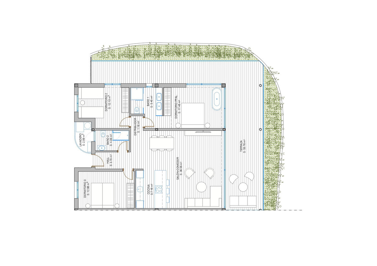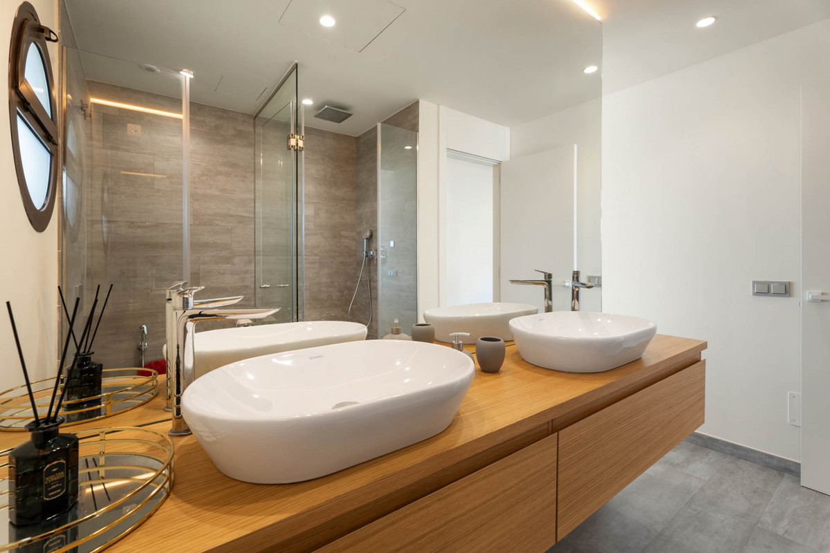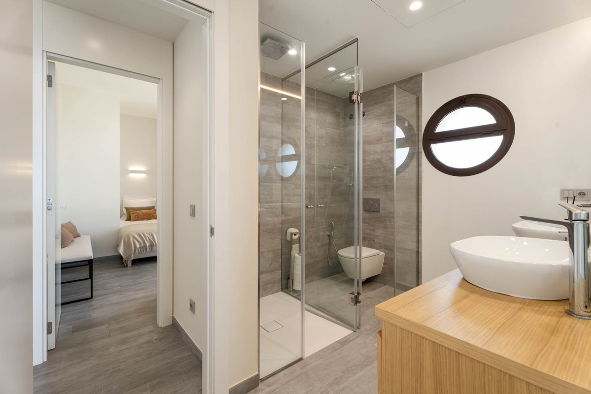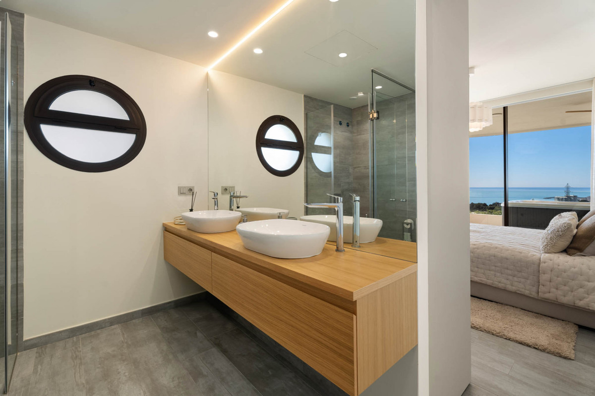 Situaded within a secure residential enclave in El Higuerón, this brand-new three-bedroom corner apartment offers refined contemporary living with open sea and valley views. Located in the most elevated and private phase of the development, the property benefits from protected outlooks due to the agricultural land set in front, preserving long-term views and privacy. With a total built interior of 117,11 m² and a spacious corner terrace, the residence is designed to create a seamless connection between indoor and outdoor living. The southwest orientation ensures natural light throughout the day and evening sunsets over the Mediterranean. The interior layout is carefully arranged. The living and dining area extends across 36.56 m², directly connected to the terrace, creating an ideal setting for entertaining or quiet retreat. The Italian Zampieri kitchen is fitted with AEG appliances and finished with clean architectural lines and functional storage. Saloni ceramic flooring runs throughout the home, reinforcing a cohesive aesthetic. The primary suite measures 17.48 m² and includes fitted Santalucia Mobili wardrobes and an en-suite bathroom with underfloor heating. Two additional bedrooms (12.13 m² and 12.88 m²) share a second bathroom, also with underfloor heating. A separate laundry room adds practicality to the layout. Built in 2025 to European CTE building standards, the apartment incorporates aerothermal climate control for efficient heating and cooling, technical exterior carpentry for enhanced thermal and acoustic insulation, and an upgraded domotics system. Blinds, lighting, and climate settings are managed via wall panels or mobile application. Integrated smart features include flood detection with automatic water shut-off, smoke detection, and power-cut alerts. The property is sold fully furnished by BoConcept and includes two underground parking spaces and a storage room. Residents enjoy landscaped gardens, an infinity pool with sun loungers, and 24-hour gated security. The apartment is within walking distance of Higuerón Resort, spa, and sports facilities, five minutes from the beach, 15 minutes from Málaga Airport, and 20 minutes from Málaga city. Property Highlights - 3 bedrooms | 2 bathrooms | 1 en-suite - 117,11 m² built interior - 81,57m² southwest-facing terrace - Sea and green valley views - Italian Zampieri kitchen with AEG appliances - Underfloor heating in bathrooms - Aerothermal climate control system - Advanced home automation system - Fully furnished by BoConcept - 2 underground parking spaces - Private storage room - 24-hour gated community with infinity pool