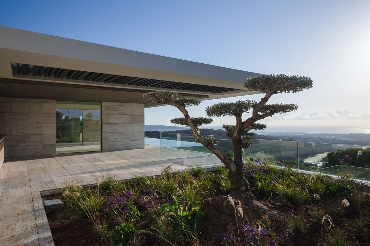Villa for sale in Sotogrande, The Sanctuary is a masterpiece located in the exclusive area of the Reserva de Sotogrande. A unique piece under the seal of architect Manuel Ruiz Moriche, in which nature, sustainability, light, natural materials and own design are the main elements to create a unique environment. As its name suggests, it is a sanctuary of tranquility designed for a dream family life, where they merge into one, its wonderful native landscape, and the privileged views of the Mediterranean Sea and the Strait of Gibraltar, preserving the natural wealth of the area. The Sanctuary has a capacity of 2.348 sqm of built area, with a total of 7 bedrooms, 7 bathrooms, a 25 meter infinity pool, a private garage for 4 vehicles, and a sunny garden designed by professionals with a multitude of different species, to create a sustainable habitat, all set on a plot of 4,405 sqm. A handcrafted masterpiece carefully designed to take advantage of maximum energy efficiency, thanks to its topographical conditions and its solar orientation, we can enjoy a villa with very low energy consumption. The property is located just 35-40 minutes from Marbella and Puerto Banus, 20 minutes drive from Gibraltar airport and just over an hour from Malaga airport.