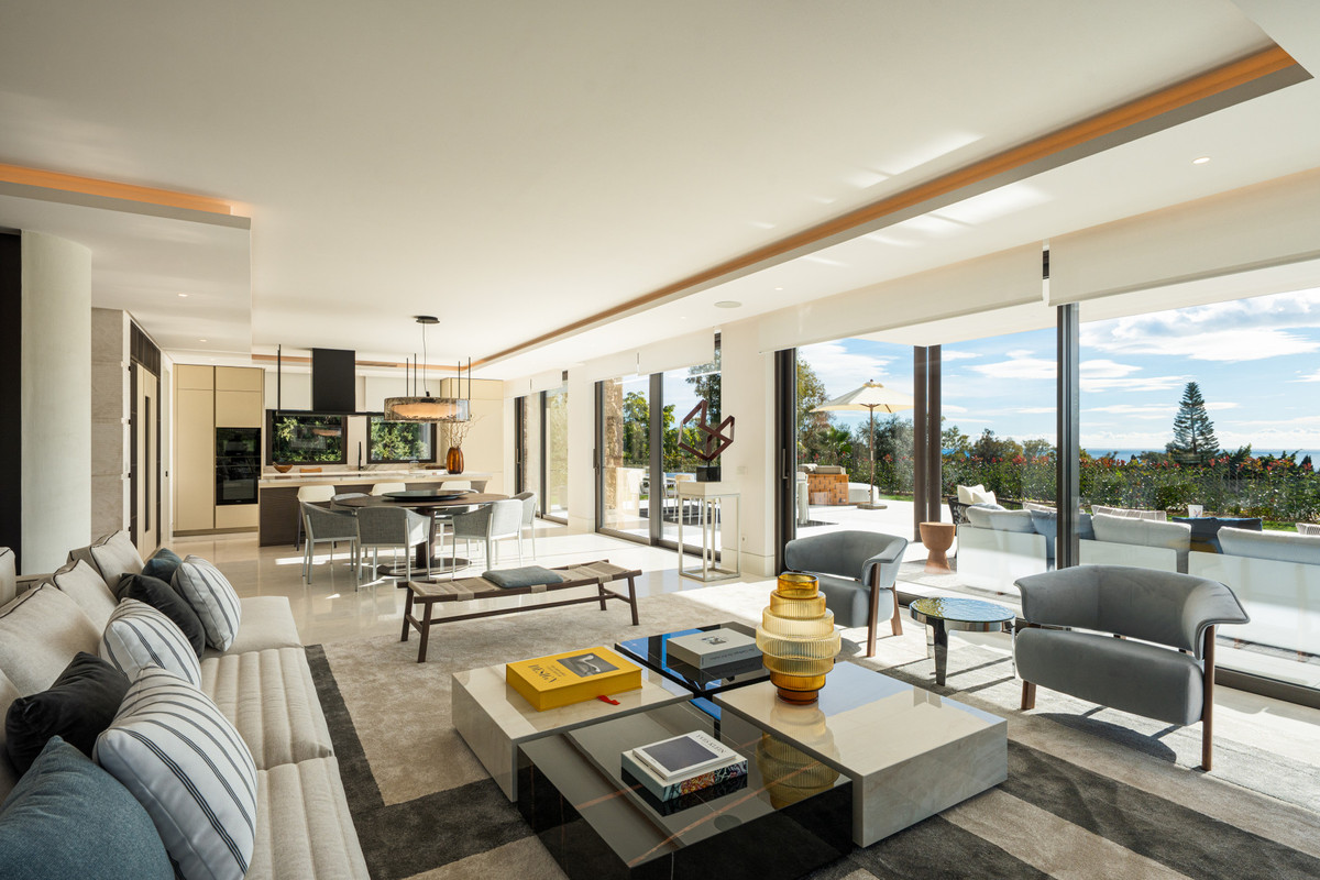 This exceptional luxury villa in Marbella Hill Club seamlessly blends refined elegance with effortless comfort, offering an exclusive lifestyle in one of Marbella’s most prestigious enclaves. The bespoke interiors by Pedro Peña are uniquely tailored to this residence, creating a sophisticated yet welcoming atmosphere that feels both timeless and distinctive. A calming neutral palette, enriched with natural materials such as wood and marble, enhances the sense of understated luxury, while meticulous attention to detail elevates every space. The open-plan living areas are thoughtfully designed to create a harmonious flow while maintaining defined zones for relaxation and entertainment. The living room invites comfort and tranquillity, complemented by curated artwork and bespoke finishes that add character and individuality. The contemporary kitchen is both stylish and functional, equipped with state-of-the-art appliances and a wine cooler, making it ideal for both everyday living and elegant entertaining. Each bedroom is beautifully appointed with premium materials and refined décor, offering a serene and luxurious retreat. The bathrooms feature double vanities, walk-in showers, and freestanding bathtubs, delivering a spa-like experience. This remarkable property also includes an exclusive bar and entertainment room, a fully equipped gym, a Turkish bath, and an indoor pool, creating a private wellness and leisure sanctuary. Set on a generous plot, the villa offers extensive outdoor areas designed to enjoy the Mediterranean lifestyle, including multiple seating areas, a private swimming pool, and breathtaking sea views. The impressive solarium features an outdoor kitchenette and additional space for relaxation and entertainment. Ideally located near the Marbella Golden Mile, this outstanding villa represents a rare opportunity to own a truly bespoke luxury residence that perfectly balances sophistication, comfort, and prime location.