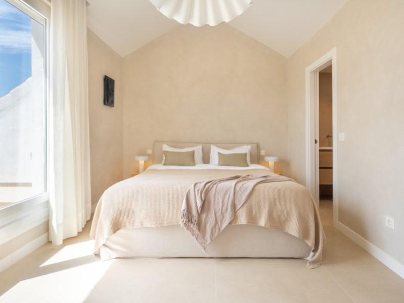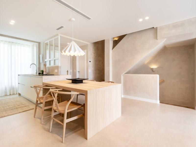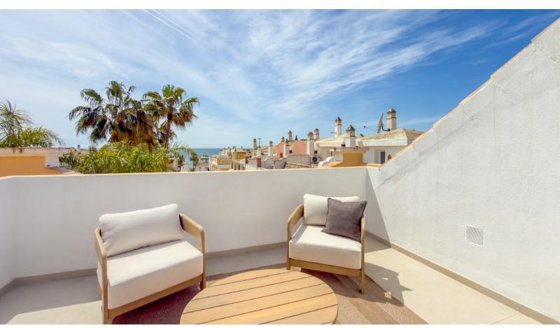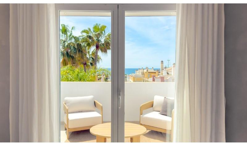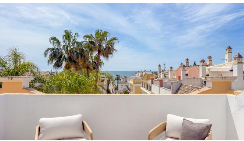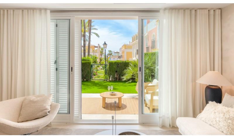 There are homes, and then there is this one. Tucked behind the private gate of Las Dunas de Bahía Marbella, on the quieter eastern side of town, a world opens up that brings together the glamour of the Costa del Sol with a stillness you'll search for in vain elsewhere. No crowds, no noisy boulevards here the beach feels like your own, the light is unfiltered, and the evenings are quiet. This fully renovated corner townhouse spreads 140 m² of living space across three floors and convinces you from the very first step. The soft palette of microcement walls, warm neutral tones and designer furniture welcomes you instantly. A sculptural pendant light above the solid oak dining table, Wishbone chairs at its side, and a clean built-in electric fireplace that gives the living room the feel of a private villa. The open kitchen with island is the beating heart of the home minimalist, efficient, and finished in the same refined palette. Cooking becomes a ritual here, hosting a pleasure that comes naturally. Three generous bedrooms and three full bathrooms on the upper floors offer privacy for family and guests alike. Premium finishes throughout, custom-built wardrobes, and the signature Mallorquina shutters that filter the midday sun and close the world out at night. On the ground floor, wide glass doors slide open to reveal the true crown jewel: a 54 m² south-facing private garden. Mature evergreen hedges guarantee complete privacy, the lawn stays fresh all year round, and a lounge is already set for the long evenings. Open a cortado in the morning sun, close the day as the palms rustle softly overhead. And then the location. The beach is a mere two-minute walk away one of the widest, quietest sandy beaches in the region, with the Mediterranean as your daily backdrop. Marbella centre is 10 minutes away, glamorous Puerto Banús 15, and Málaga airport just 35 minutes by car. The complex itself breathes quiet elegance: a communal swimming pool surrounded by mature tropical gardens, low building density, and a gated entrance for security and privacy. Included with the property is a private underground garage with storage of 35 m² a rare luxury in an area where parking is often scarce. Fully styled and move-in ready. All you need to do is pack your bags.